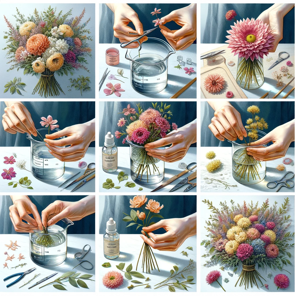 アートフローラ 一液くんが提供するプリザーブドフラワー加工サービスについてのご案内 プロポーズや結婚式などの特別な瞬間に贈られる貴重な花々を永遠の記憶へと変え... 基本的な作成手順